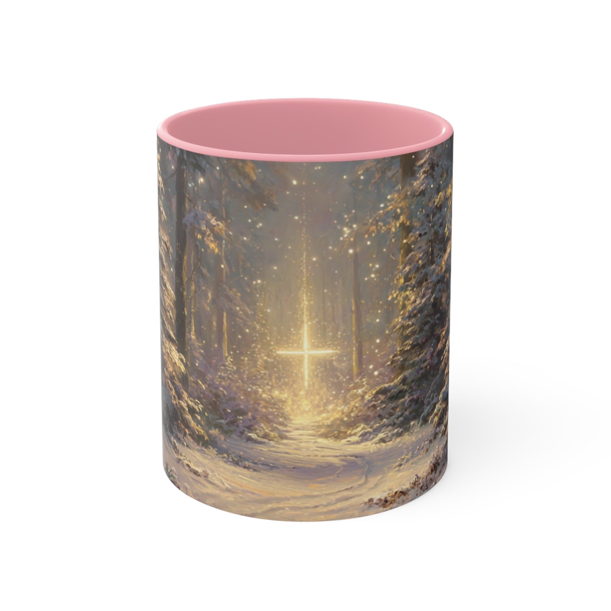 Step into a moment of quiet reflection with every sip. The Winter Path of Faith mug wraps a serene forest scene around your hands — gentle snowfall, tall shadowed pines, and at the center, a warm glowing cross that feels like hope shining through the winter hush. The blush-pink interior and matching handle add a soft, uplifting contrast, blending warmth and beauty in one peaceful design.