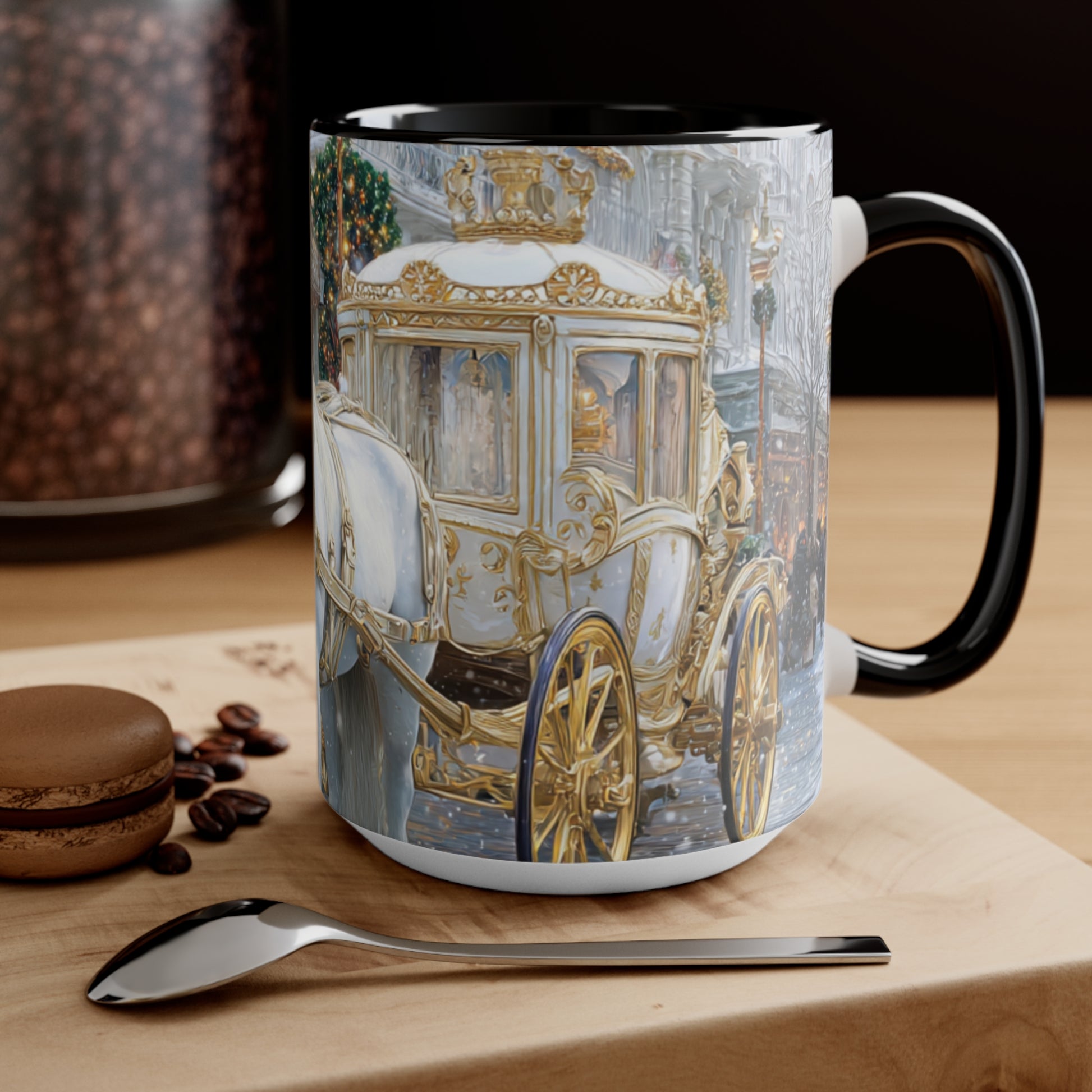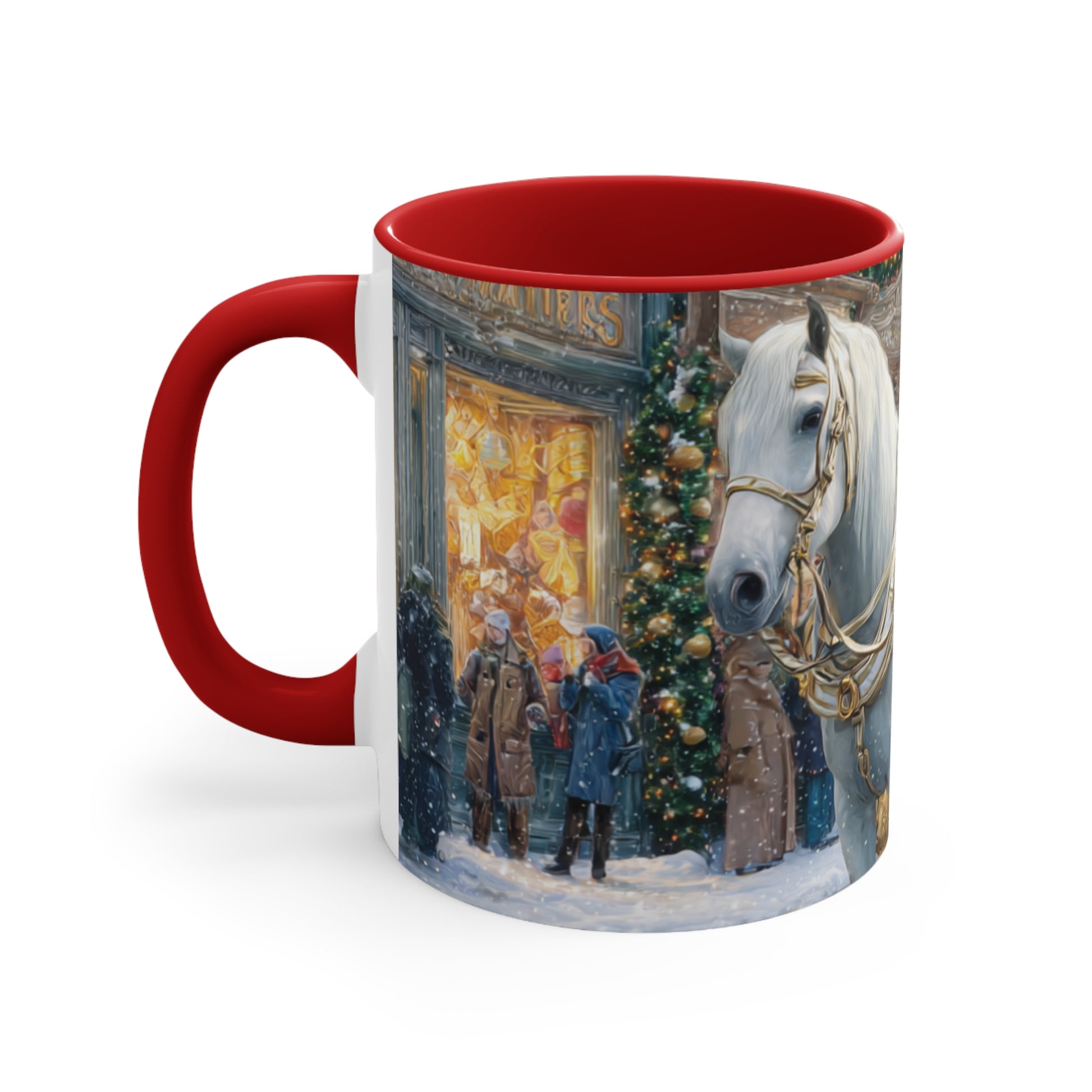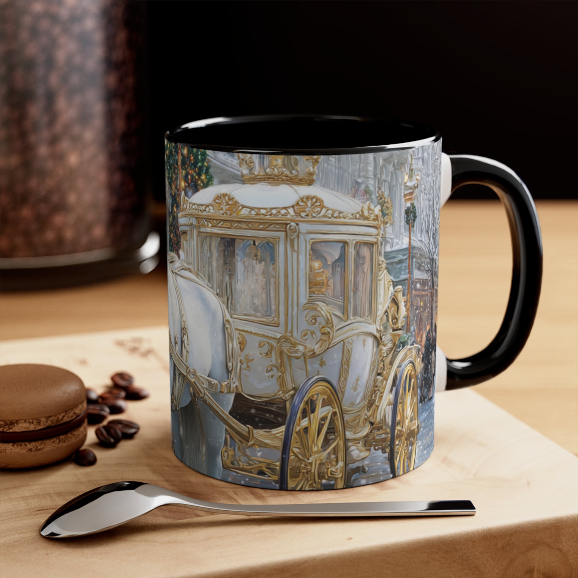 Step into a peaceful, snow-kissed moment every time you lift the Golden Grace Carriage Ride mug. This charming ceramic accent piece wraps you in a storybook scene: a regal white horse and gilded carriage waiting outside a warmly lit storefront, soft flakes drifting down, and touches of holiday greenery completing the magic. The colored interior and handle add a cheerful pop that echoes the cozy glow of the artwork, making each sip feel like a nostalgic pause in the middle of winter’s hush.