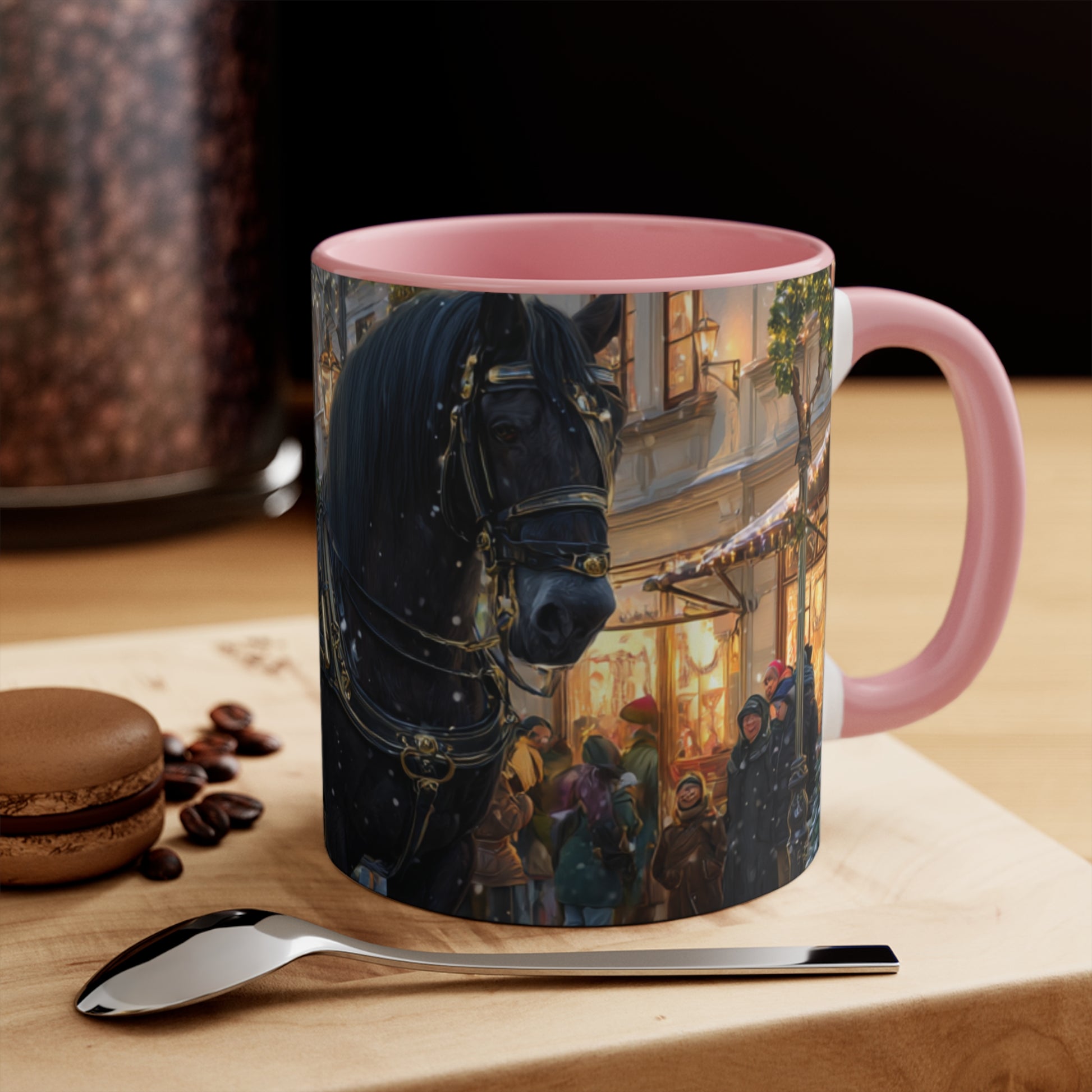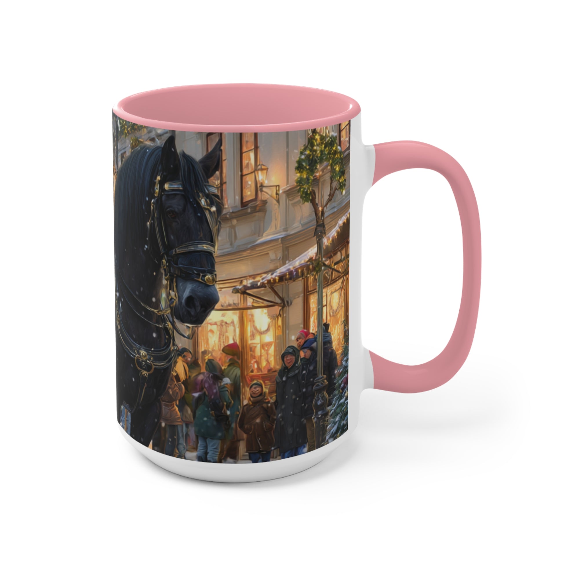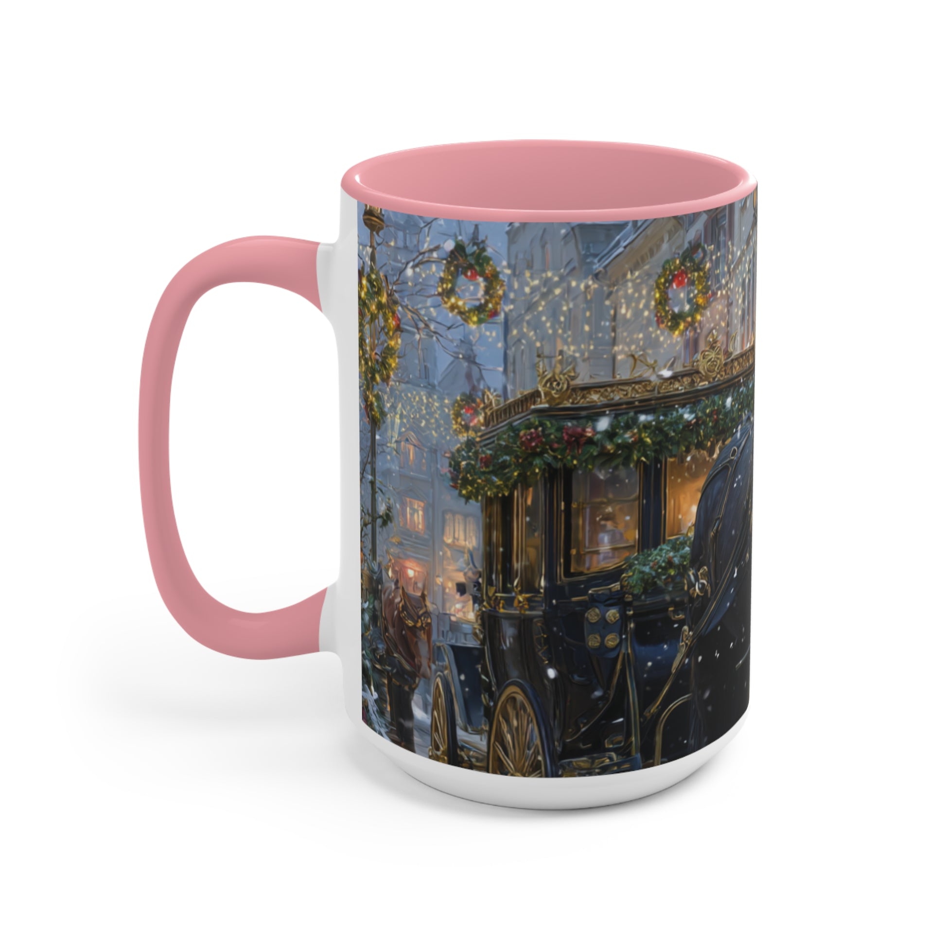 Wrap your hands around a moment of pure holiday charm. The Winter Carriage Glow accent mug pairs a candy-pink interior and handle with a beautifully detailed winter carriage scene—twinkling lights, festive wreaths, and the soft ambiance of a lantern-lit street. One sip and you can almost hear the gentle clink of the horse’s harness and feel the crisp winter air mingling with the steam from your drink.