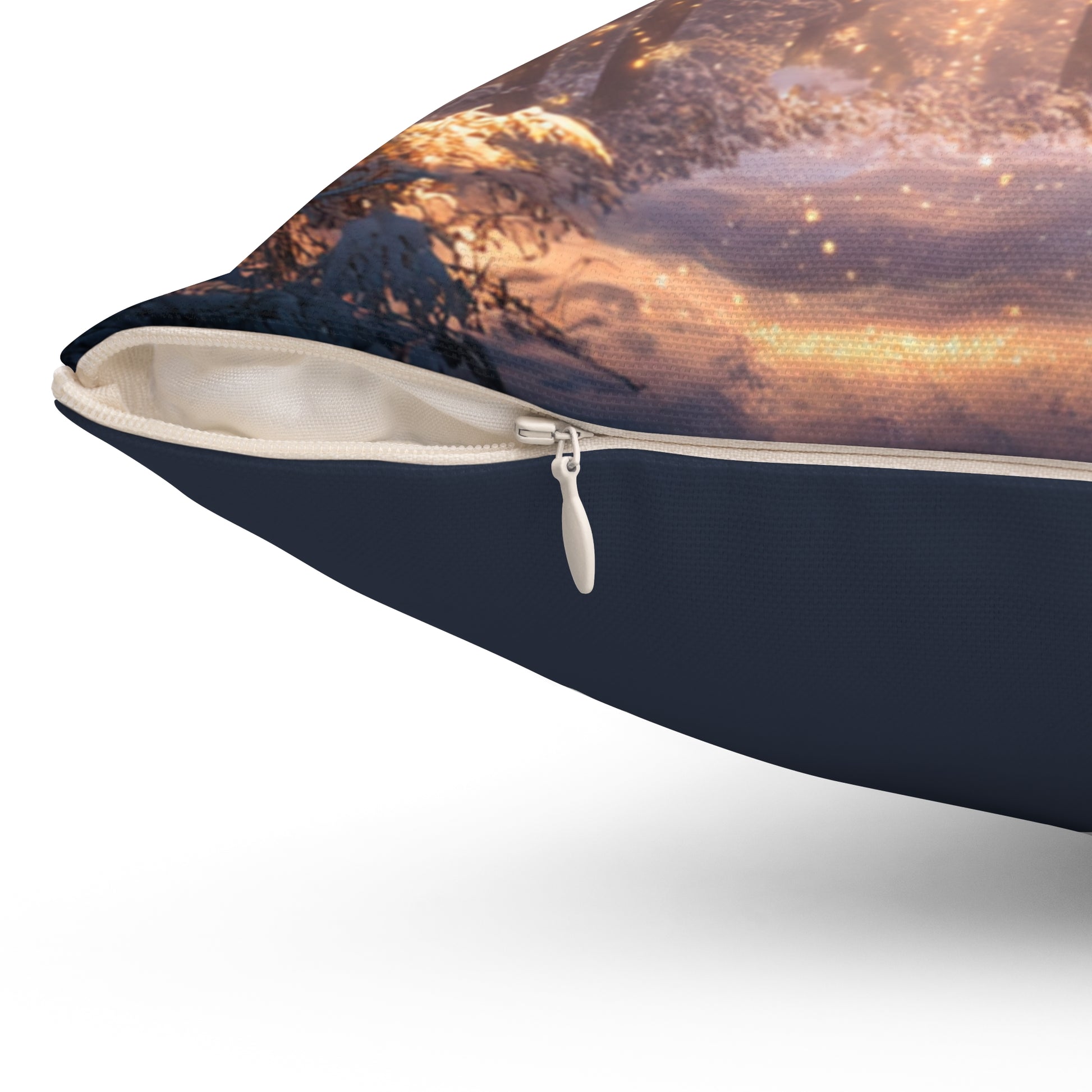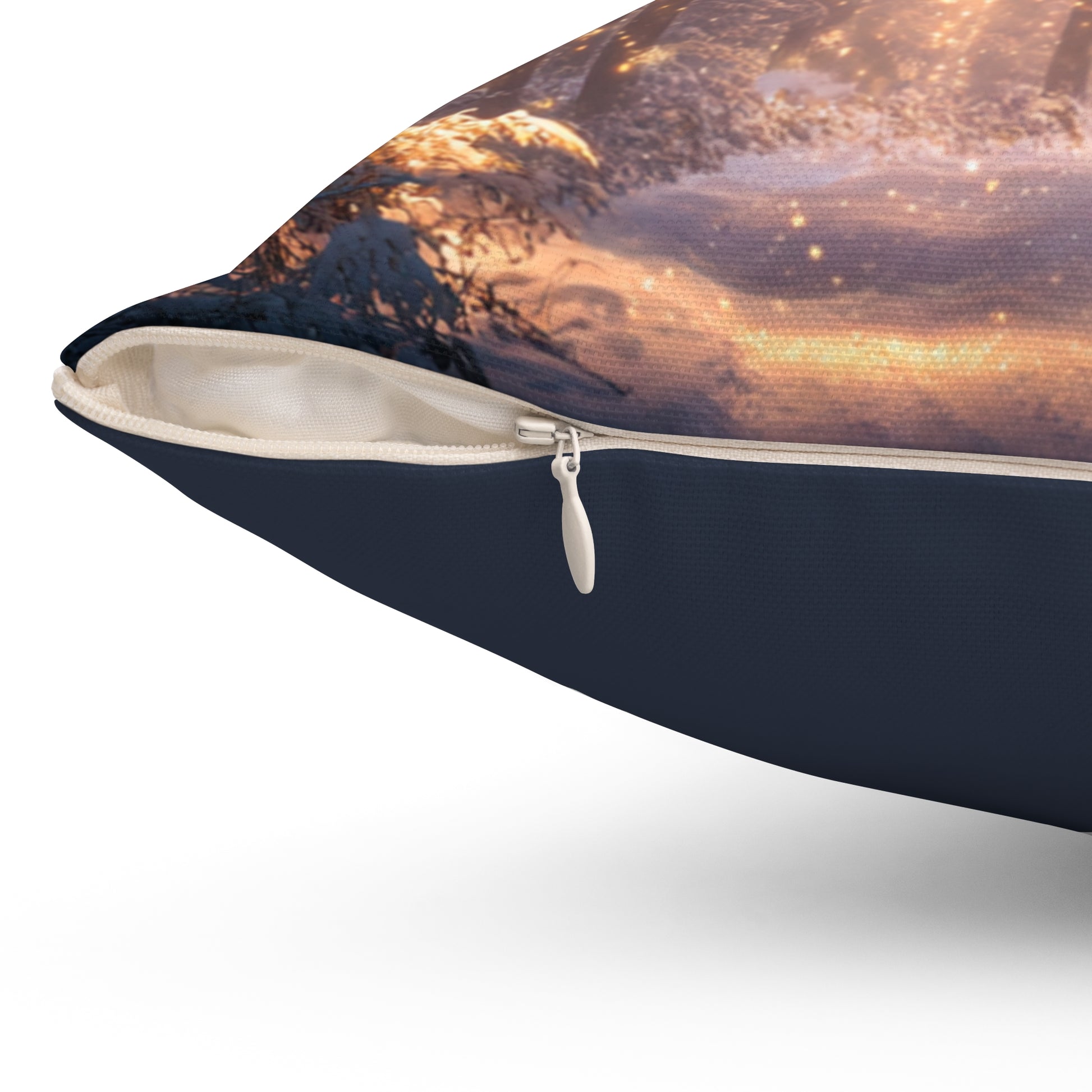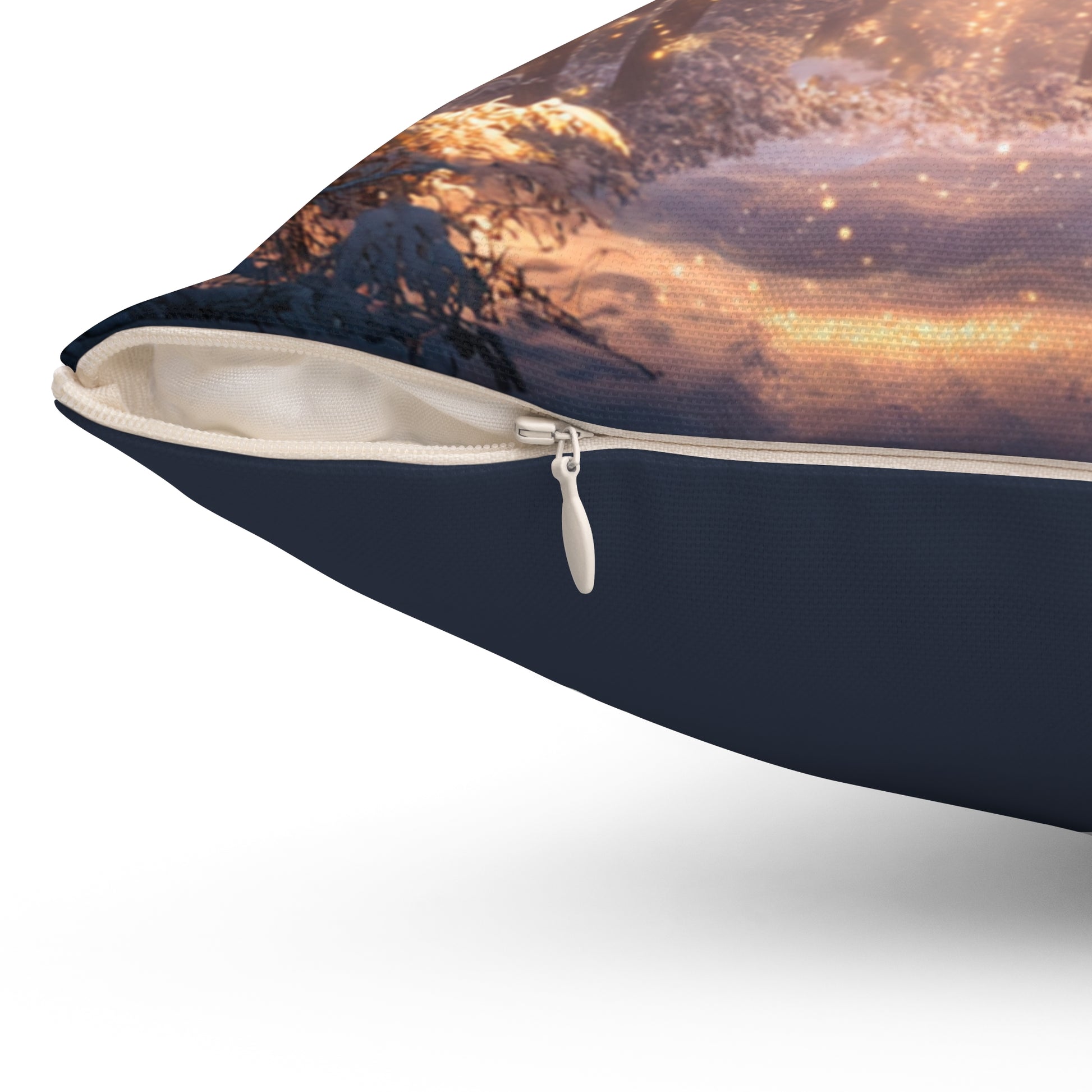 The spun polyester cover is smooth, durable, and beautifully wrinkle-resistant, keeping the scene crisp season after season. A concealed beige zipper preserves the clean lines, while the recycled polyester insert—intentionally oversized—expands into a plush, full silhouette once fluffed. Whether placed on a sofa, nestled in a reading chair, or tucked into a cozy nook, this pillow adds a sense of peace, warmth, and wintertime wonder.