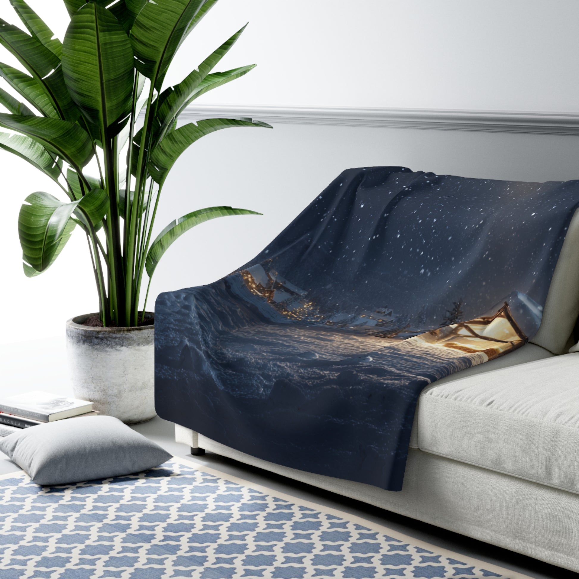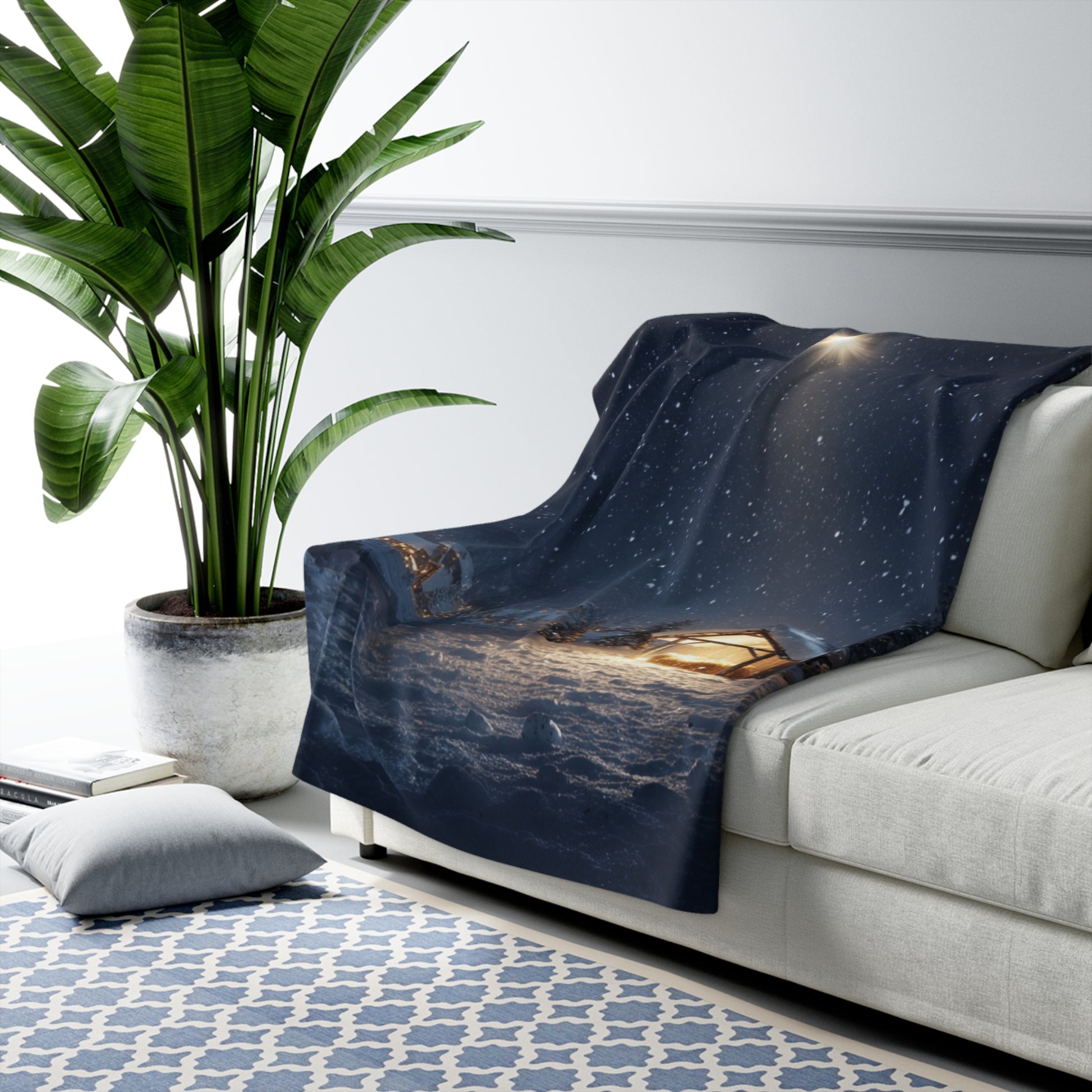 Under a deep midnight sky, a single radiant star shines above a humble stable, casting a gentle glow over the holy nativity. In the distance, a quiet town rests beneath the heavens, its warm lantern lights flickering softly against the dark. This sherpa fleece blanket captures the peaceful wonder of that sacred night — calm, reverent, and full of hope.